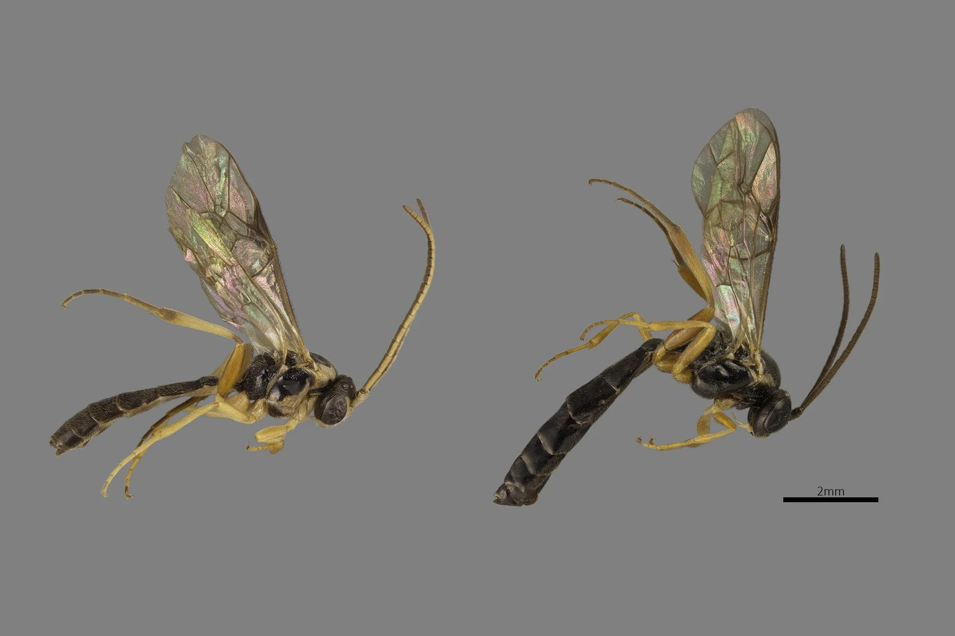 Phthorima xanthaspis (Thomson, 1890) mâle (à gauche) et femelle (à droite). Cette espèce d'Ichneumonidae est un parasitoïde de larves de Syrphidae mangeurs de pucerons (aphidiphages)