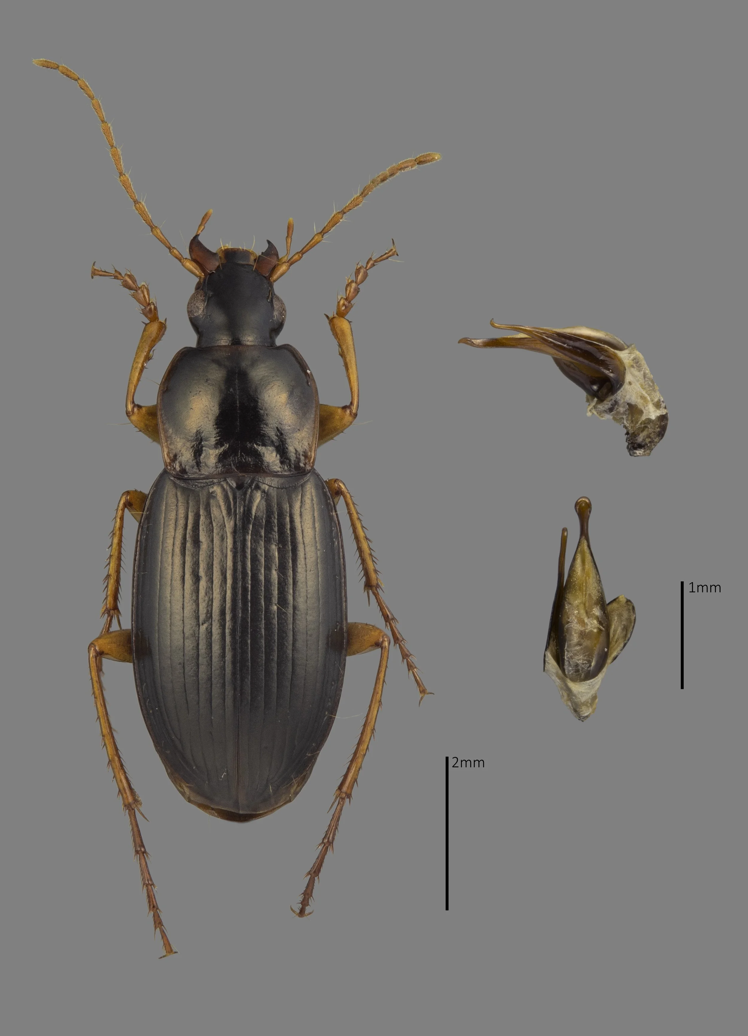 Calathus micropterus (Duftschmid, 1812) mâle et son edeage en vue latérale gauche (haut) et dorsale (bas). Cette espèce se trouve un peu partout en Europe mais est surtout commune au Nord et dans le massif Alpin en France
