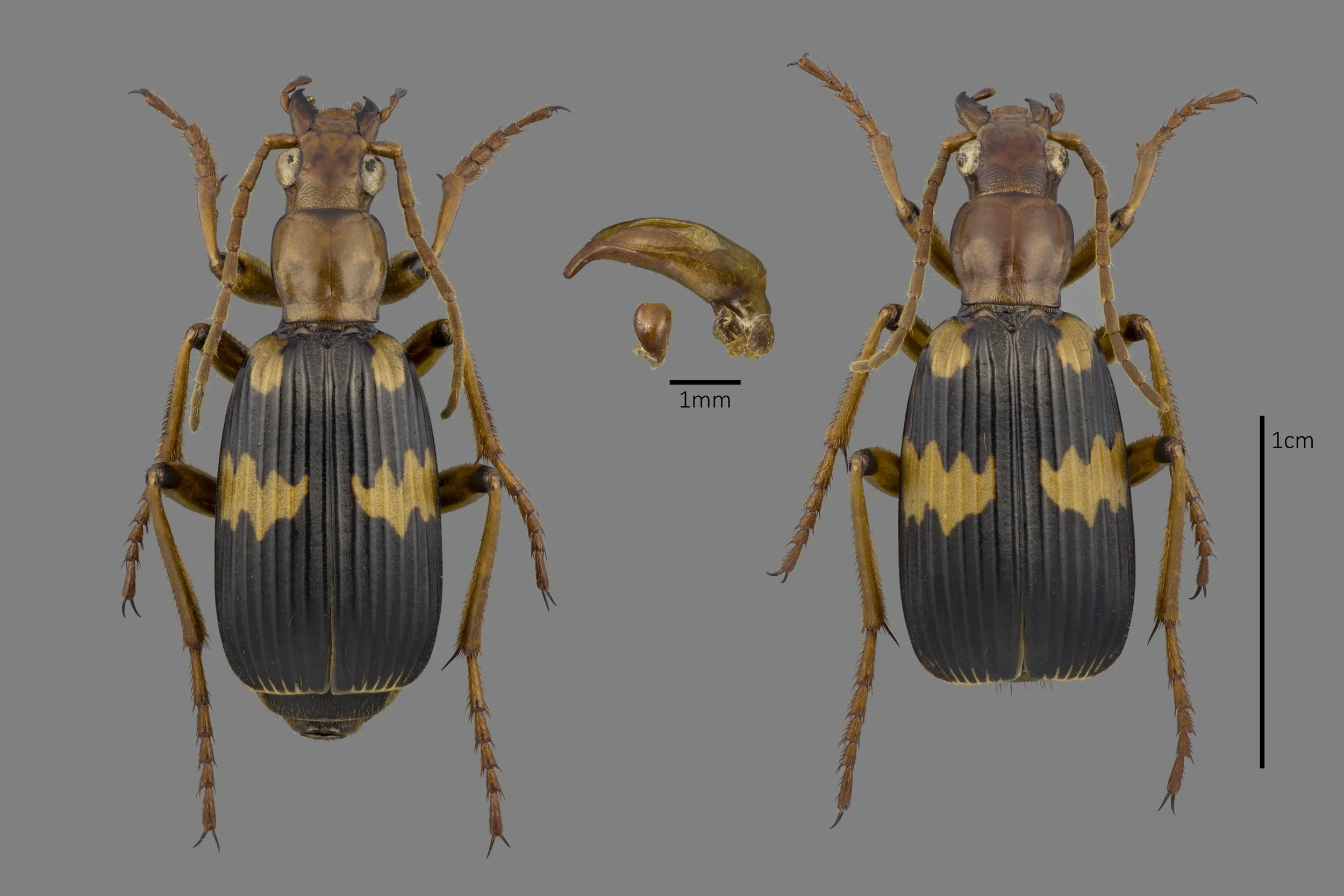 Pheropsophus hispanicus (Dejean, 1824) est une espèce de Carabidae qu'on trouve en Espagne et au Portugal. Sur cette image, le mâle se trouve à gauche et la femelle à droite. L'edeage, qui est l'organe copulateur du mâle, est au milieu et son paramère gauche est détaché sur reste de l'organe